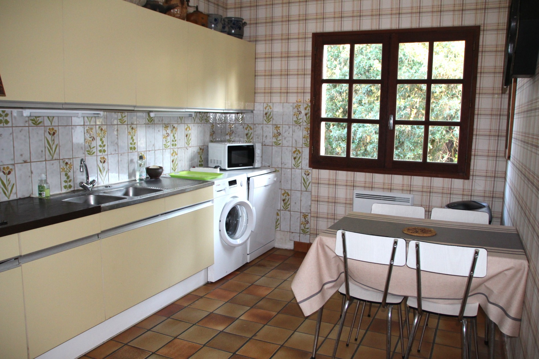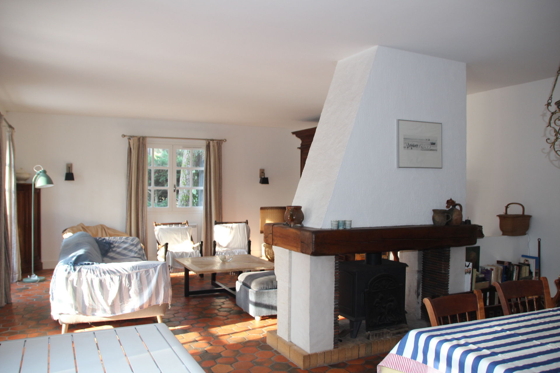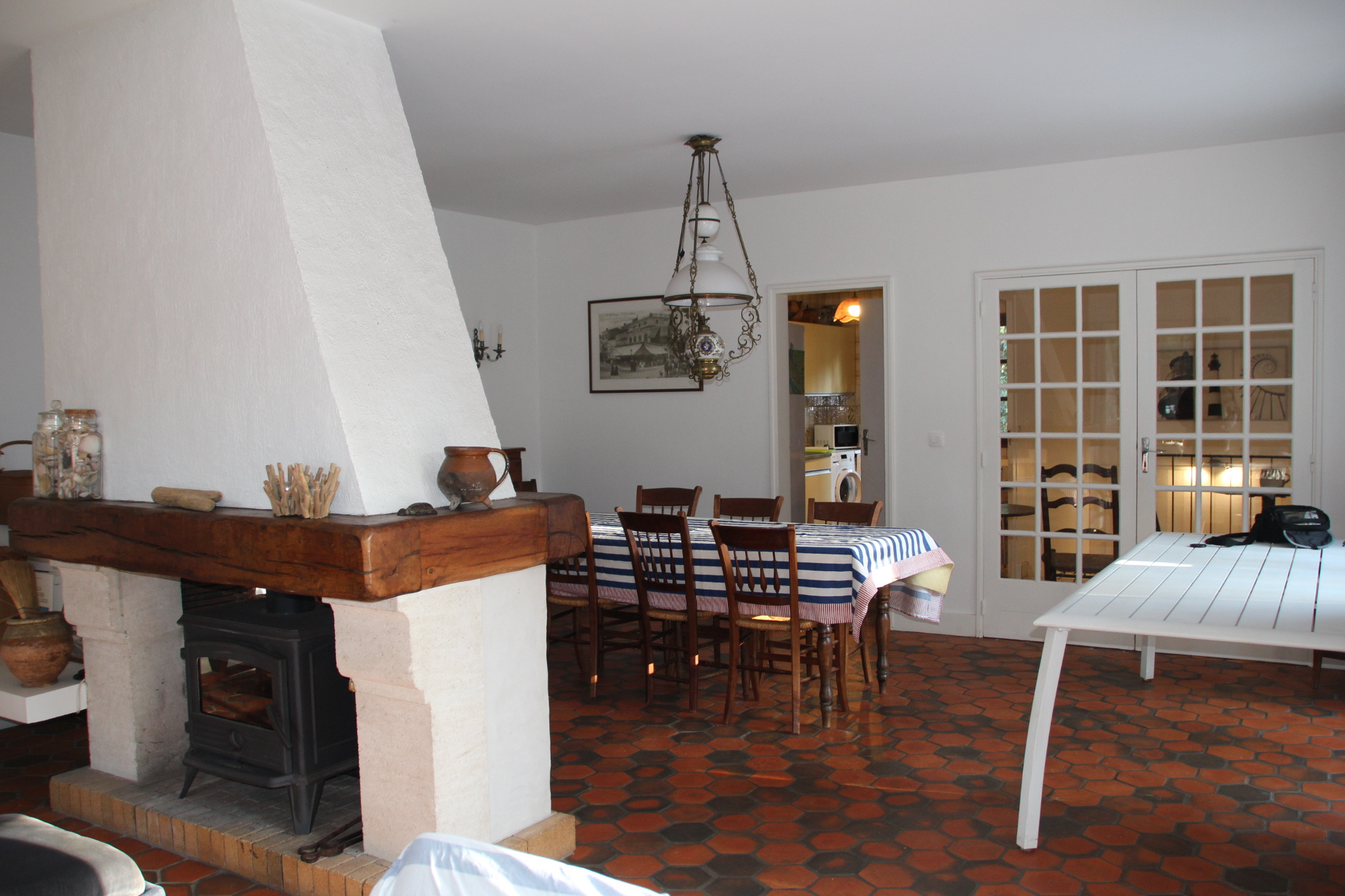– Au rez-de-chaussée surélevé de 1 marche : entrée, grande pièce de vie avec poêle central donnant sur agréable terrasse orientée au Sud-Ouest, cuisine, 2 chambres avec placard, salle de bains, W.C. et dégagements.